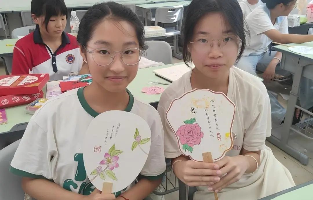 美术课堂中,中学1班的同学们亲手在绘制的团扇落下点睛之笔,方寸之间凝结匠心,合影记录下这份成就的喜悦;中学2班则用铅笔勾勒曾侯乙编钟的雄浑轮廓,让青铜厚重感在纸端重生。相较于小学的创意手工,中学课程更注重技法实践与文化内涵的挖掘,同学们在绘制团扇、复刻编钟轮廓时,展现出对传统艺术的细致解读。