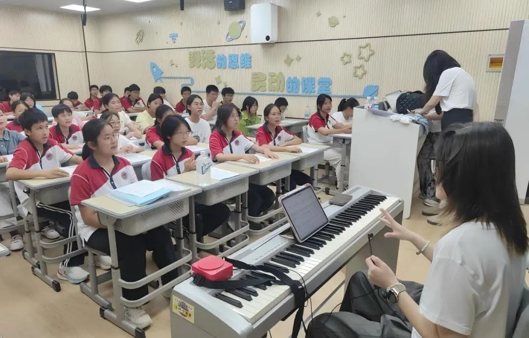 音乐课上,两个班级四位老师齐上阵,带领全体同学热情排练《上春山》的春意盎然。课程不仅包含基础乐理深化,更侧重合唱技巧与情感表达,同学们在和声中感受音乐的层次感,以更成熟的艺术理解演绎作品。