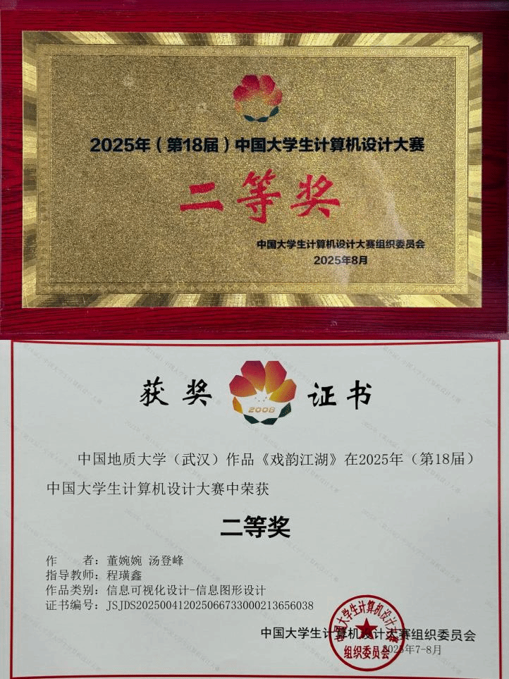 2025年8月11日,第十八届中国大学生计算机设计大赛决赛在浙江理工大学圆满落幕。由米乐官网环境设计系支部书记程璜鑫副教授指导,董婉婉、汤登峰同学创作的作品《戏韵江湖》在信息可视化设计专业组中脱颖而出,荣获全国二等奖。