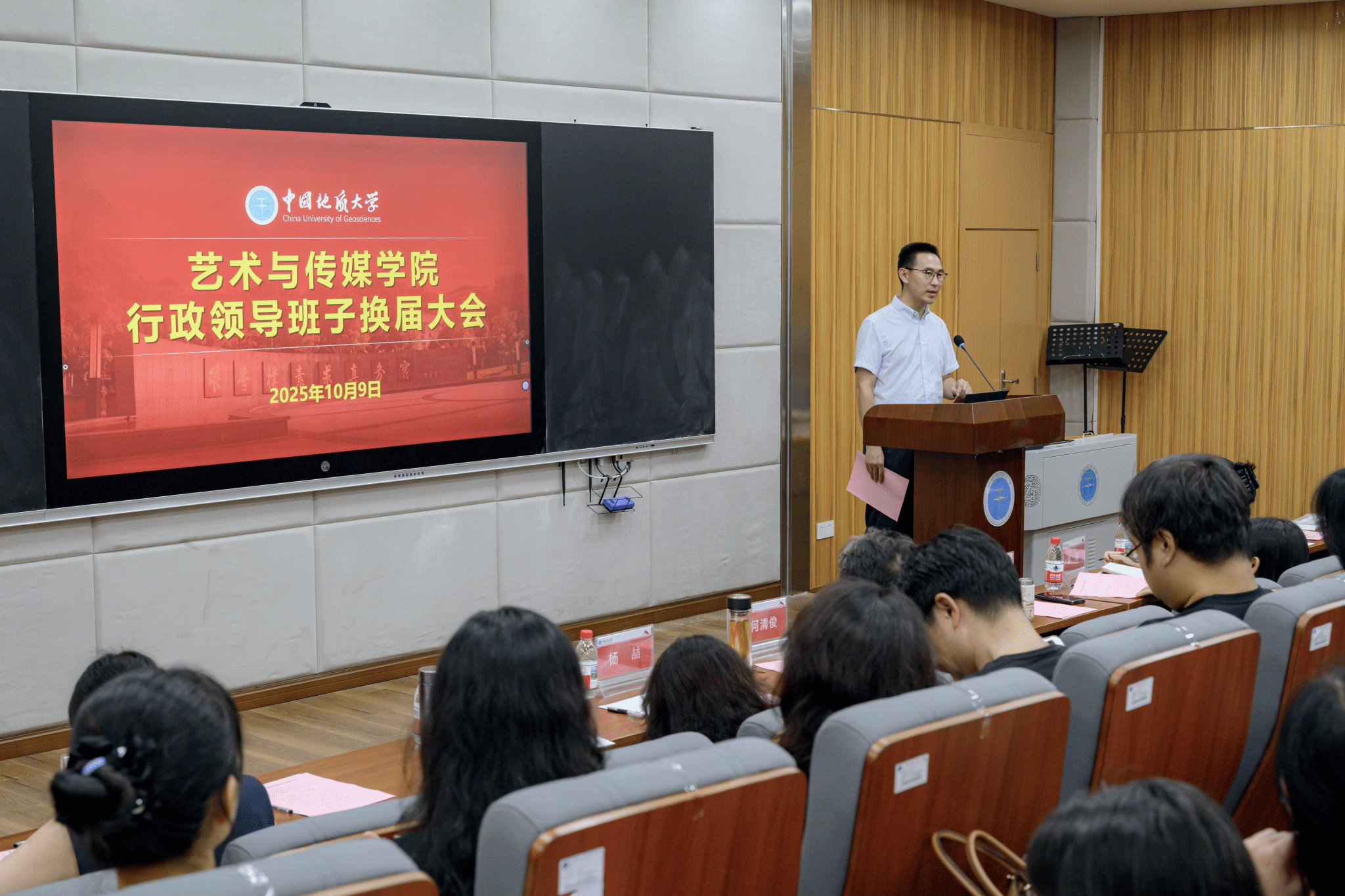 何清俊院长代表现任行政领导班子作换届述职报告。他表示,在学校党委行政的坚强领导下,五年来学院深入贯彻落实立德树人根本任务,紧密围绕《“十四五”事业改革与发展总体规划》战略部署,团结带领全院师生在党建引领、人才培养、学科建设、科研创新、队伍建设、社会服务等方面取得了阶段性成效:一是强化政治引领,推动党建与事业发展深度融合,完善治理机制,提升决策效能;二是聚焦学科特色,人才培养质量稳步提升,强化实践育人,完善全过程质量管控,保障人才培养成效;三是强化学科建设,深化学术交流,完善科研管理机制,拓展社会服务,推动科研创新与社会服务取得新突破;四是坚持引育并举,大力推进人才队伍建设,师资队伍结构持续优化;五是夯实育人根基,打造文化品牌,构建地大特色美育体系;六是细化学生管理,深耕品牌活动,构建招生就业联动机制和心理健康教育体系,提升思政育人与就业成效。