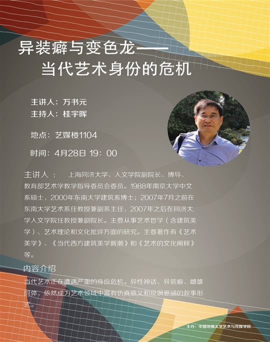 (通讯员:陈康 拍摄:毕鸿辉)2017年4月28日晚19点,教育部艺术学教学指导委员会组员,同济大学人文学院副院长万书元教授做客米乐mile官方网站1301室,作了题为《异装癖与变色龙——当代艺术身份的危机》的专题讲座。桂宇晖院长主持了此次讲座,武汉大学杨雪松教授、武汉理工大学雷鑫博士等参加了此次讲座。