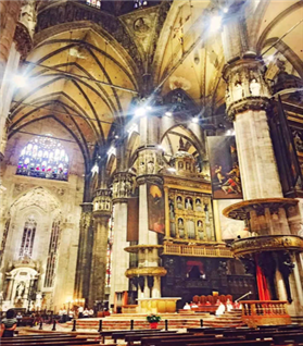 2016年8月13日,意大利写生实习小组一行14人从武汉出发,经由法国巴黎,飞往时尚之都米兰。经历了十多个小时的飞行后,大家见到了在意大利生活多年的马林老师及其夫人。第二天一大早,写生实习小组便向市中心的米兰大教堂出发了,途经圣西罗体育场与圣玛利亚感恩教堂时,马老师停下车向我们介绍了这两处享誉世界的意大利名地。一路上大家都惊叹不绝,当见到米兰大教堂时,大理石造就的哥特式建筑以其壮丽的姿态震撼了所有人。它的外观有如茂密的尖塔丛林直指天空,壮阔非凡,其内部结构也同样恢弘大气。