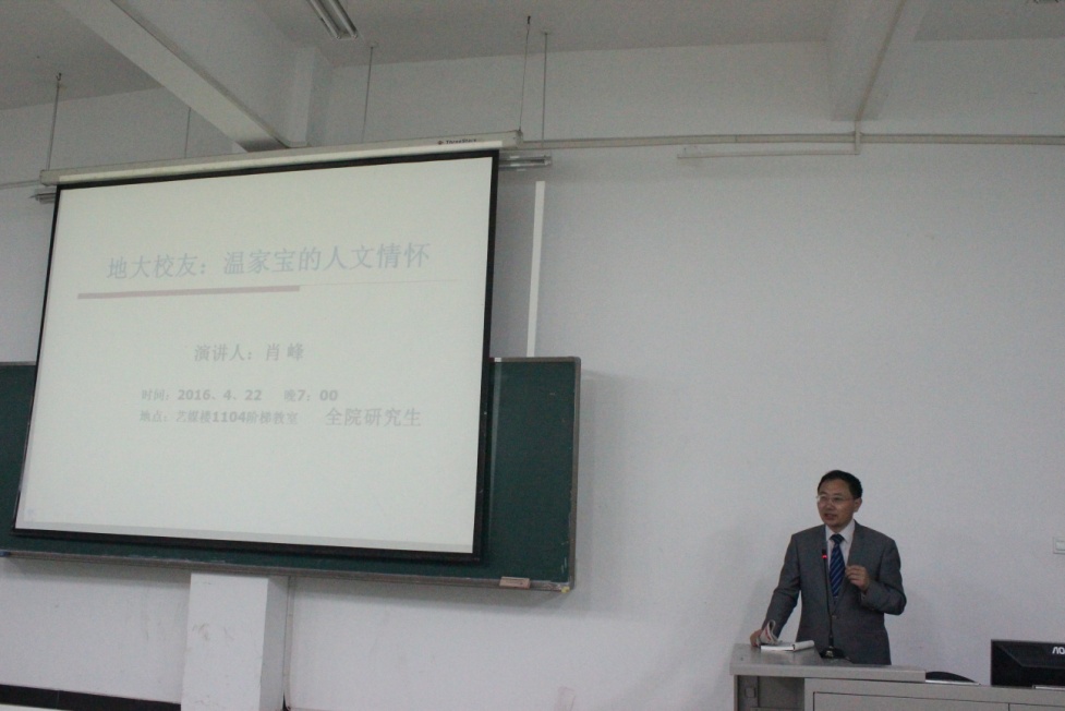 (通讯员许红梅 李铭洋 摄影刘鸣)4月22号晚7点,2016年艺术与传媒系列讲座第三讲在艺媒楼1104 教室如期举行。米乐官网新闻传播系肖峰教授,为同学们详细讲述了地大校友温家宝的人文情怀。