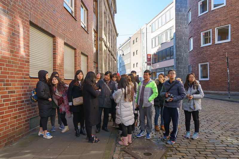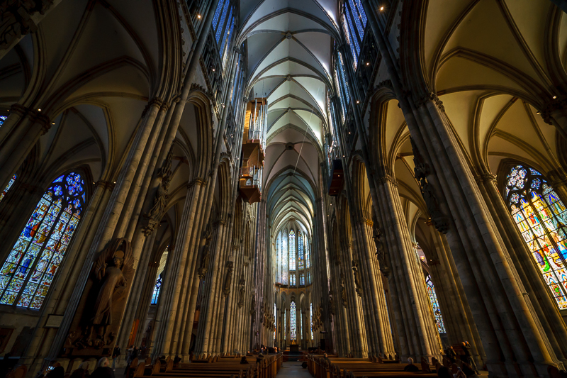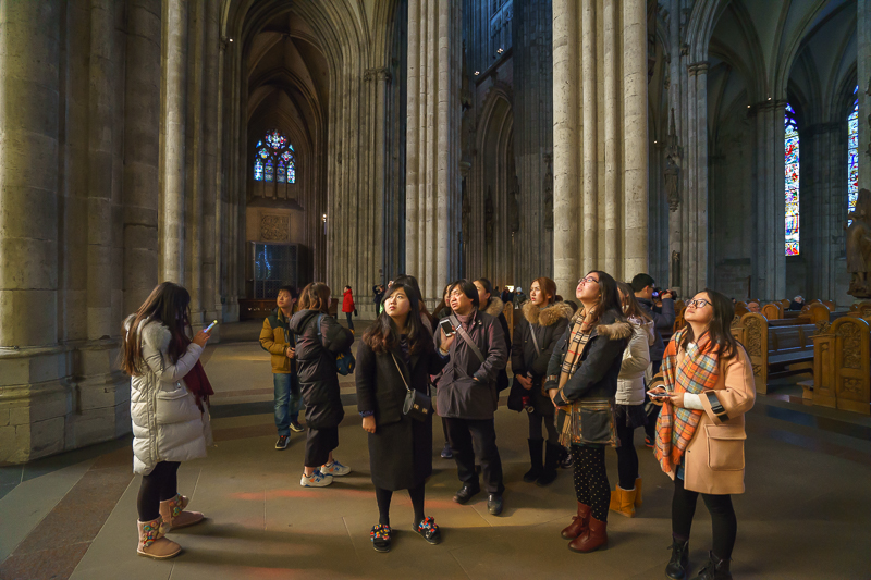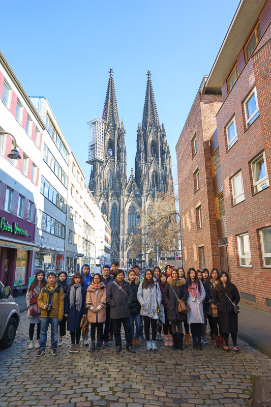 午时12点51分,访学团抵达科隆,并在马林老师的引领下前往参观科隆大教堂。科隆大教堂是科隆市的标志性建筑,亦是耗时超过600多年,至今仍修缮不断的典型哥特式风格教堂。马老师认为,在所有的教堂中,科隆大教堂的高度居德国第二,世界第三。同时,它也是欧洲北部最大的教堂,哥特式教堂的建筑特点在这里得以完美体现。此外,他还表示:“在二战期间,欧洲的大部分教堂都遭到破坏,当时整个科隆也是一片废墟,走投无路的德国士兵全部躲在教堂之中,一旦美军继续轰炸,他们终将战死于此。但不可思议的是,美军宁可空降,也不愿做出破坏科隆大教堂的事情,也正是因为如此,作为信仰象征和欧洲传统文化见证的科隆大教堂才最终得以保存下来。”随后,访学团跟随马林老师进入教堂内部参观。