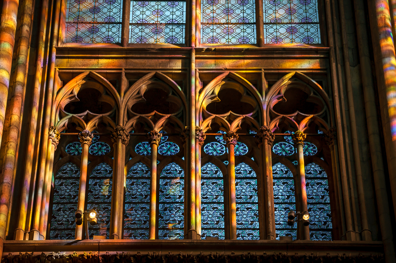 科隆大教堂的内部结构与米兰大教堂十分相似,连花窗玻璃都相差无几,但马林老师却认为它们之间并不完全相同。他指出:“在科隆大教堂的内部,其中一个窗框上镶嵌的并非普通的花窗玻璃,而是现代艺术家李希特的作品。德国为了把李希特推向世界,而将这面墙上原有的花窗玻璃拆除,换上用特殊材质制作而成的李希特的作品。这种材料十分特别,当阳光照进教堂的时候,便会在教堂的墙面投射出李希特作品的样子,并产生彩色光束的效果,十分美丽,亦象征着永久。”语毕,更带领访学团成员在教堂内部继续参观。