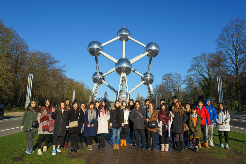 早9点55分,访学团穿过布鲁塞尔世博中心,到达原子塔。原子塔位于布鲁塞尔市西北郊的海瑟尔高地,是布鲁塞尔十大名胜之一。它造型独特,精妙绝伦,其大胆的构思赢得了访学团成员的一致好评。对此,马林老师表示:“原子塔是比利时为纪念1958年世界博览会而设计的,其设计构思是将金属铁分子的模型放大1650亿倍,人们曾评价它是‘世界上最令人感到震惊的建筑’,同时,它也有着‘比利时的埃菲尔’的美称。”语毕,马林老师便邀访学团全体成员在此合影留念。