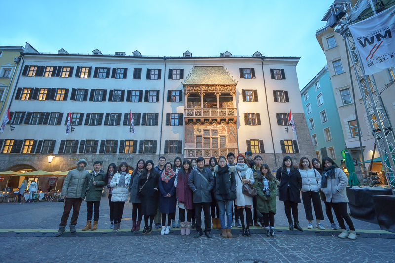 下午17点10分,访学团正式抵达因斯布鲁克,并在马林老师的带领下经老城区前往参观金顶屋。金顶屋位于因斯布鲁克城中心的弗利德里希公爵大街,仅屋顶就高达3.7米,且由2600块镀金铜瓦镶嵌而成,十分华丽。马林老师认为,金顶屋是在1494年间,马克西米利安一世迎娶西班牙公主之际,由马克西米利安委任尼克拉斯修建而成。它将原有的破旧楼房改建为哥特式穹窿的观赏阳台,以便在此观赏戏剧和表演。参观完毕,马老师更携访学团全体成员以金顶屋为背景,在广场前合影留念。
