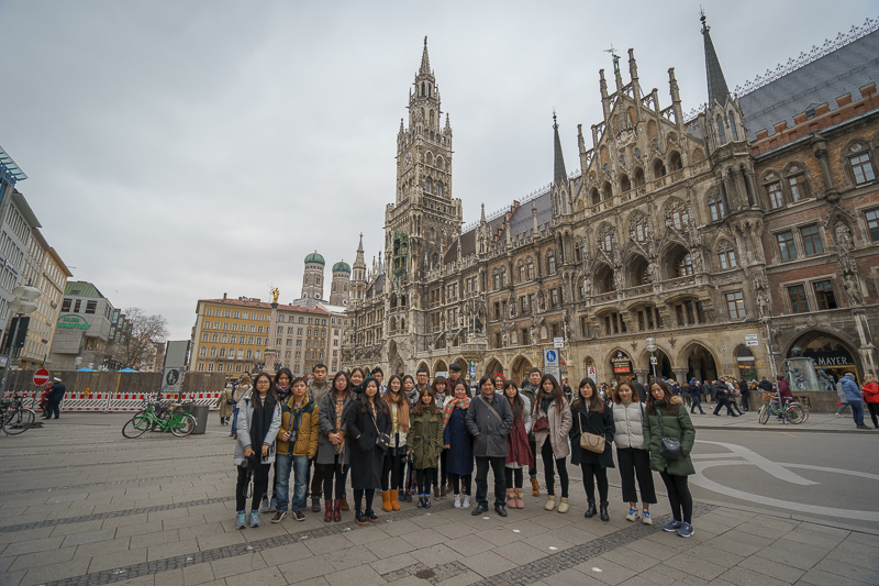 玛利亚广场是慕尼黑的市中心广场。广场中部立着圣母玛利亚的塑像,北面则是慕尼黑市政厅。站在广场的中心,马林老师向访学团讲述了广场上玛利亚塑像的由来,更手指着市政厅中间的钟楼,示意访学团细细观赏,并表示:“在市政厅中间的钟楼上有着著名的玩偶报时钟,在每日的上午11点与下午5点,报时钟内的玩偶便伴随着音乐而出,展现1568年威廉五世大婚与消灭黑死病的场景。而在广场的西北面,则是著名的洋葱顶圣母教堂,它造型独特,是慕尼黑的象征。”