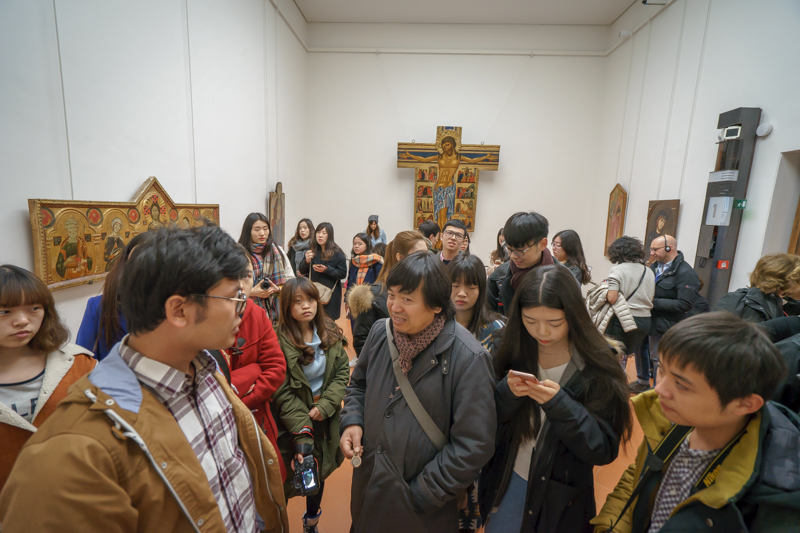 乌菲齐博物馆位于在意大利佛罗伦萨市乌菲齐宫内,以收藏欧洲文艺复兴时期和其他各画派代表人物如达·芬奇、米开朗基罗、鲁本斯、拉斐尔等人的作品而蜚声海外。马林老师认为,要细看馆内每一件作品,则所需时间太长,因而需要选择馆内最为精华的部分来观赏。说罢,便带领访学团一行进入博物馆内部,并有计划的欣赏馆内作品。