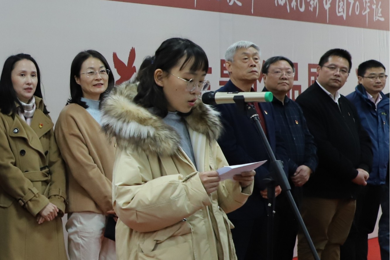 2019级设计学专业本科生杜俊彦代表参展学生发言。杜俊彦用极富文采的语言表达了自身对新中国一路走来历经艰险,取得的辉煌成就的触动,展示了作品的创作意境。最后,杜俊彦对全体学生发出号召:要以“何时缚住苍龙”的决心与勇气,为祖国的明天贡献自己的力量。
