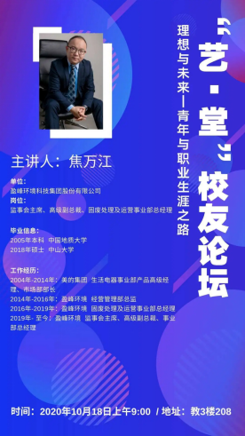 (通讯员 单湉艺)10月18日,米乐mile官方网站米乐mile官方网站优秀校友、现任上市公司盈峰环境科技集团股份有限公司监事会主席、高级副总裁、固废处理及运营事业部总经理焦万江先生,莅临南望山校区教三楼208室,为地大学子开展以理想与未来为主题的讲座。米乐mile官方网站党委书记郭秀蓉老师、党委副书记吴仁喜老师、景观系龚斌老师、就创处刘志兴老师以及100余人学生参加此次校友论坛。