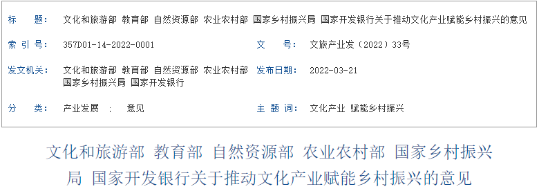 今年,为贯彻落实乡村振兴战略和《中共中央国务院关于做好2022年全面推进乡村振兴重点工作的意见》,文化和旅游部、教育部、自然资源部、农业农村部、国家乡村振兴局、国家开发银行近日联合印发《关于推动文化产业赋能乡村振兴的意见》,其中提到要把“文化引领、产业带动”、“科学规划、特色发展”等作为基本原则,将文化产业赋能乡村振兴,将优秀传统乡土文化得到有效激活。其中,创意产业、美术产业、文旅融合等作为重点赋能来将更多美术元素、艺术元素应用到乡村规划建设中,兴建特色书店、剧场、博物馆、美术馆等。