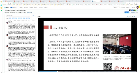 各位党员通过视频详细回顾了习近平总书记在人大的调研过程,重点学习了习近平总书记关于智慧课堂和课程思政的评价与期望。老师们表示,要坚持党的领导,坚持马克思主义指导地位,坚持为党和人民事业服务,不断推进课程思政的教学改革创新,结合各专业教学内容,在教学过程中培育“四个自信”理念,坚定不移走中国特色社会主义道路;在学习建团百年的重要讲话精神后,老师们纷纷表示在新的征程上,作为教育工作者,应清醒认识到,中国共产党立志于中华民族千秋伟业,必须始终代表广大青年、赢得广大青年、依靠广大青年,用极大力量做好青年工作,确保党的事业薪火相传,要引领青年学生担当起党和人民赋予的历史重任,踔厉奋发、勇毅前进,用青春的能动力和创造力激荡起民族复兴的澎湃春潮,用青春的智慧和汗水打拼出一个更加美好的中国!