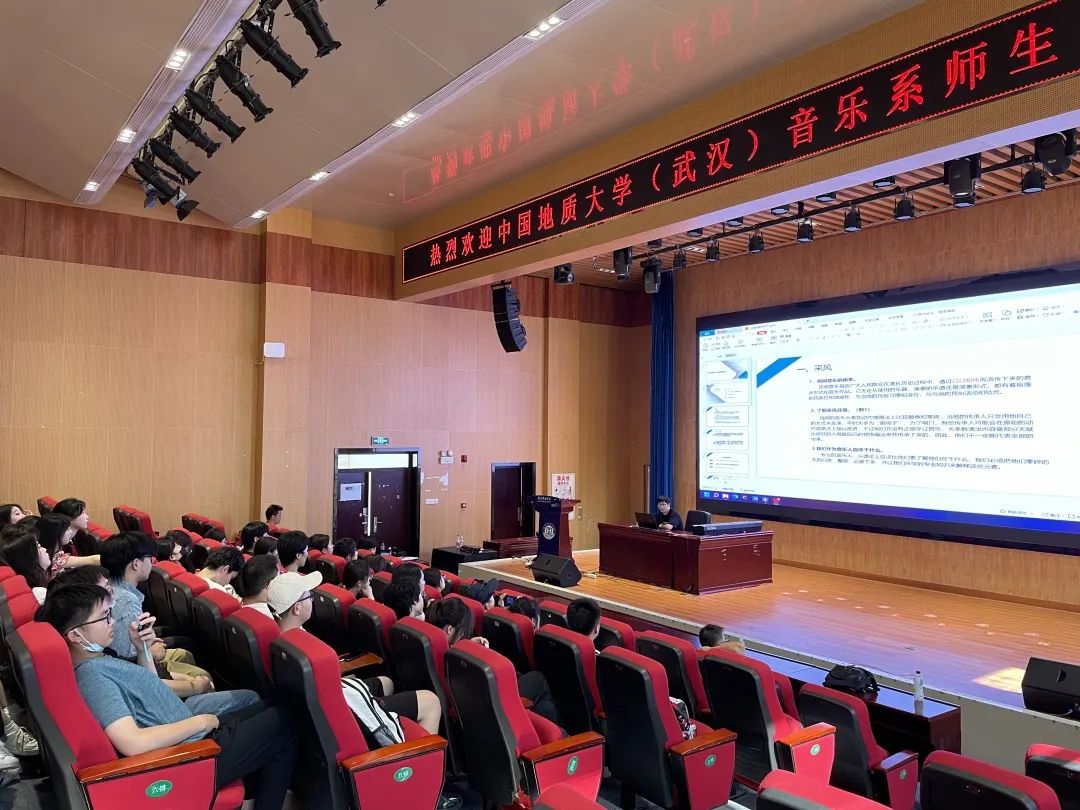 随后我们乘车来到了湖北恩施学院,由我校优秀校友现湖北恩施学院的音乐系主任邓聪老师为我们授课。他介绍了土家音乐的乐器配器及其民歌特点等,并对于收集民间音乐后如何提炼升华,结合自身的创作对土家族的音乐进行二度创作进行讲解。