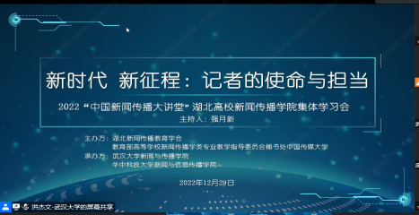 (通讯员于梦涵 王琦)2022年12月29日下午是支部主题日活动时间,为创新支部学习形式,进一步深入贯彻学习党的二十大精神,下午14:30,新闻传播系支部组织动员师生参加以“新时代 新征程:记者的使命与担当”为主题的2022年中国新闻传播大讲堂——湖北分会场在线学习会,来自省内23所高校、2000余名师生参加,米乐官网新闻传播系全体教师、研究生和本科大一的同学们参加了此次学习。