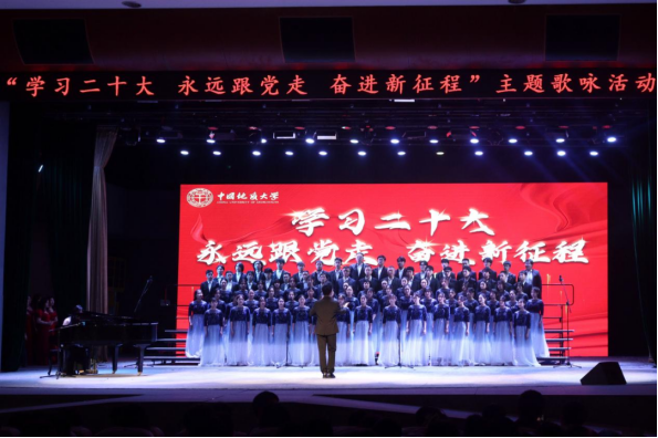 为贯彻落实学校主题教育实施方案当中“在‘重实践’上下功夫”的有关要求,深入学习党的二十大精神,营造团结奋斗、昂扬向上的精神面貌和学习氛围,进一步激发师生的爱国热情和使命担当,5月21日晚米乐官网八十多名师生在弘毅堂参加了由学校举办的“学习二十大,永远跟党走,奋进新征程”主题歌咏比赛。