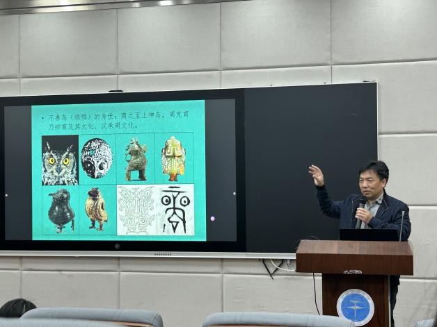 讲座围绕文字图像学符号学研究的历史以及应用展开,内容环环相扣。练教授首先用大家所熟悉的新石器时代的鹳鱼石斧图彩绘陶缸以及三星堆的权杖作为开场,通过案例告诉大家图案具有丰富的含义,可以起到文字记录的作用,且随着历史时代的不同,同一个符号内容也会蕴含不的含义。