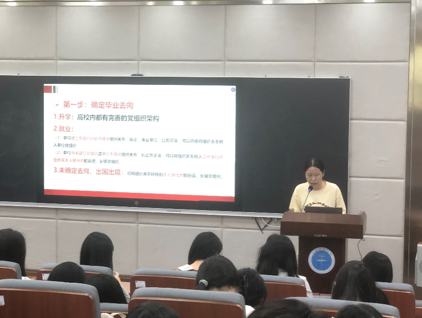 会议第四项,兼职辅导员于梦涵为大家仔细讲解党员关系转接的注意事项和转接流程,提醒各位毕业生党员及时做好党组织关系转接。