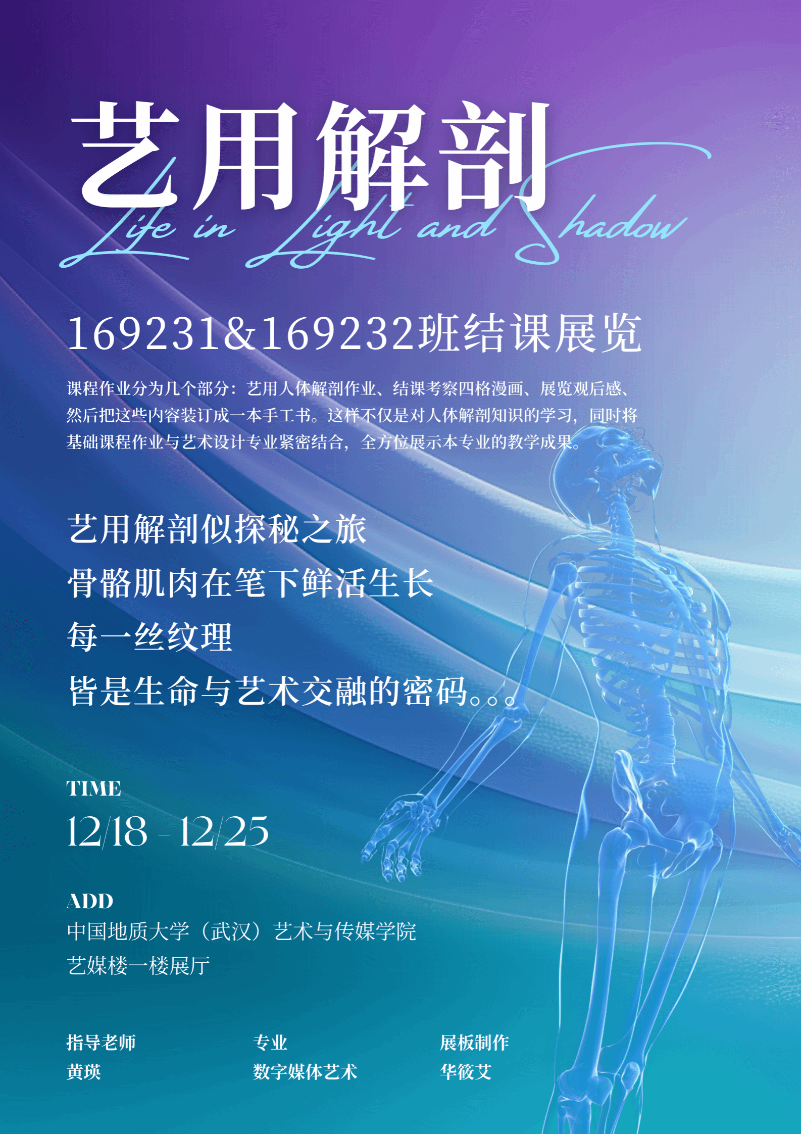 (通讯员:汤雨禾 周睿琪)2024年12月18日-2024年12月25日,在艺术与科学的交汇点上,米乐mile官方网站大楼一楼中厅,黄瑛老师指导数字媒体艺术专业169231&169232班的学生们以一场结课展览,展现了艺用解剖学的独特魅力。这场展览展示了学生们对人体解剖学的深刻理解,同时将艺术设计与课程作业紧密结合,以手工书的形式,多角度呈现了艺用解剖学的丰富内涵。