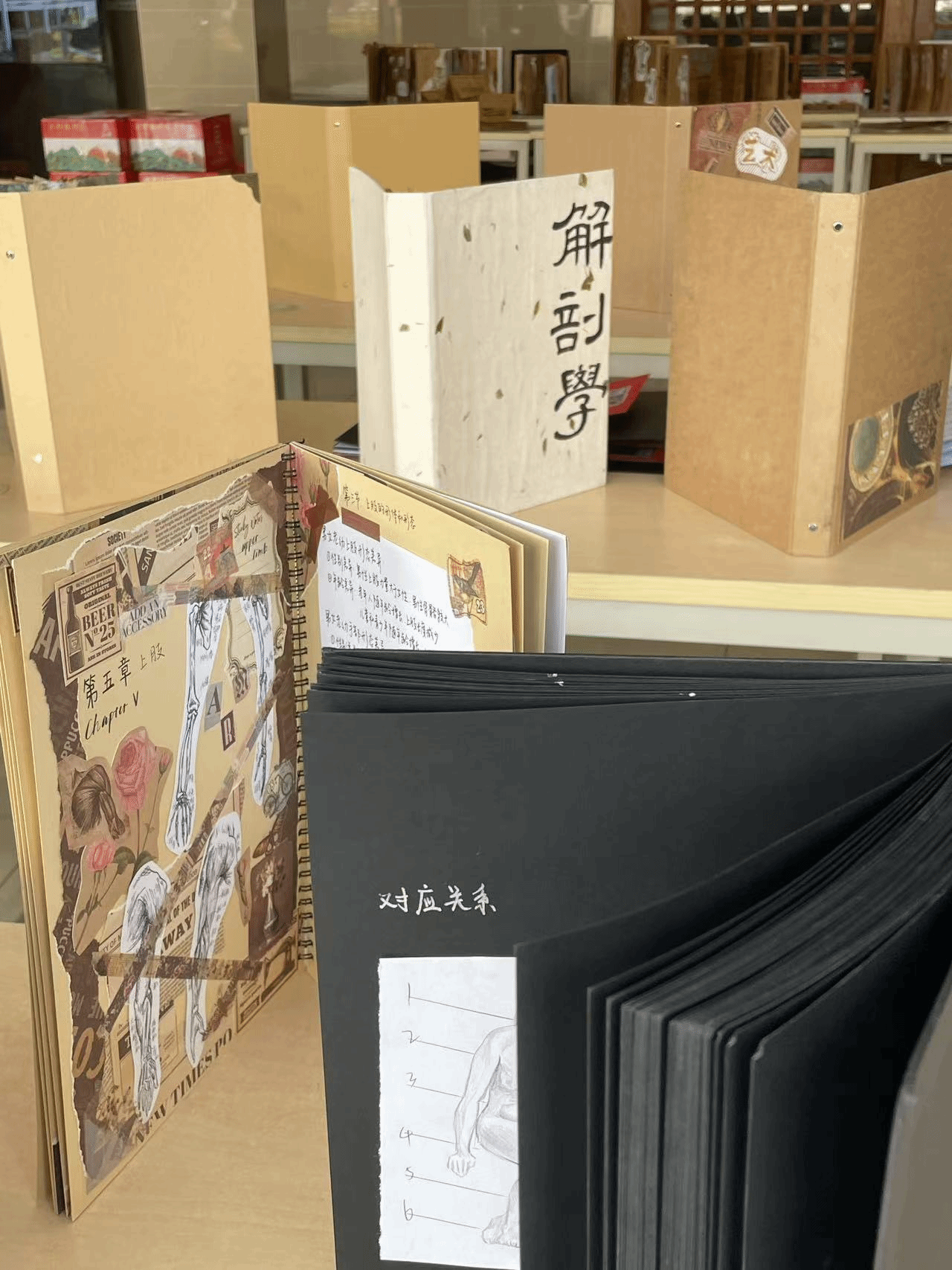四格漫画里,学生们妙笔生花,用漫画捕捉人体结构,艺用解剖学知识融入四格,趣味横生。通过细致的描绘,展现出人体骨骼和肌肉的结构与动态。四格漫画以生动有趣的构思,将艺用解剖学的知识以轻松的方式传达给观众。展览展示了多本关于艺用解剖学的手工书,这些手工书由各位学生制作,涵盖了艺用解剖学的多个方面。通过课程学习,同学们在手工书中介绍人体骨骼、肌肉、器官等基础知识,通过手绘插图和详细标注,让读者更直观地了解人体结构。