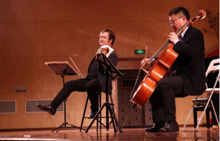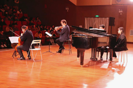 4月27日晚19:00,为提高全校师生美育素养,共享美育工作成果,“南望未来,艺熠星空--世界经典室内乐作品专场音乐会”在北区音乐厅隆重举行。中国地质大学(武汉校长王焰新院士、校党委书记黄晓玫教授等多位领导莅临音乐会现场。米乐mile官方网站米乐mile官方网站教授、小提琴中提琴演奏家、圣彼得堡国立音乐学院博士、“地大学者”王凯平教授,联合湖南师范音乐学院教授、俄罗斯音乐艺术学科博士、青年大提琴演奏家陈果教授,以及湖南科技大学校聘副教授、俄罗斯圣彼得堡国立音乐学院钢琴独奏、室内乐演奏双博士、旅俄青年钢琴演奏家彭斯特副教授,一同向我们呈现了一场精彩绝伦的视听盛宴。整场音乐会持续一个半小时,分为上、下两场,分别演奏了《拉赫玛尼诺夫g小调钢琴三重奏》与《柴可夫斯基a小调钢琴三重奏》两首知名室内乐作品。