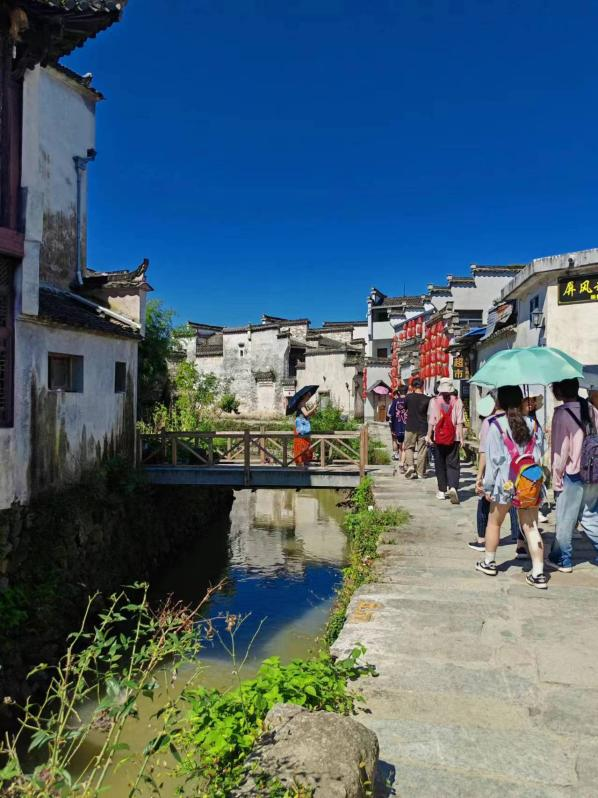 首站到屏山村,屏山村位于安徽省黄山市黟县县城东北约4公里的屏风山和吉阳山的山麓。属于典型的江南水乡村落。同学和老师们跟随导游走进这个千年古村,了解它的历史并观赏原生态的村落。村里的宗祠都非常漂亮,采用彩塑砖雕,里面的木雕也非常精美。该村沿溪而建的民宅、古朴的石桥、桥下潺潺的溪水,构成了典型的“小桥、流水、人家”的徽派风格,有着浓厚的生活气息,漫步在其中心也跟着变得宁静。