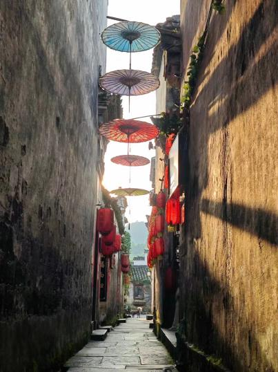 第六天,大家来到了宏村考察,宏村相比皖南地区其他的徽派民居更加商业化,这里的淳朴和自然已经逐渐淡化,但好在白墙青瓦的民居建筑保留了徽州的特色和历史文化。村落依山傍水,村中的月昭池是宏村特色的点缀,古民居在月昭池上的倒影如同一幅水墨画,大街小巷的涓涓细流也让宏村更具有活力。当天的绵绵细雨打湿了石板路,清新潮湿的空气沁人心脾,配合随处可见的红灯笼,给人即闲适又热闹的感受,此刻我们远离了城市的喧嚣,真正进入这座千年古村。
