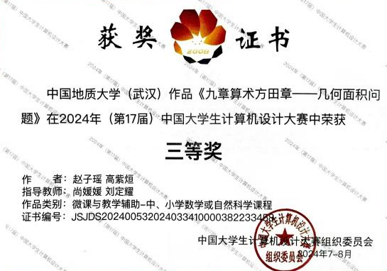 在2024年(第17届)中国大学生计算机设计大赛决赛中,由米乐官网教师指导的参赛队伍获得1项国家级三等奖,3项中南赛区一等奖、3项中南赛区二等奖、3项中南赛区一等奖。2021级广电专业的高紫烜和赵子瑶创作的作品《九章算术方田章》参与了在沈阳进行的国赛决赛并获得了微课类三等奖。该场决赛共吸引了来自厦门大学、武汉大学、四川大学、哈尔滨工业大学、华中科技大学、中国人民大学、东北大学等全国490所高校的885件作品参赛。