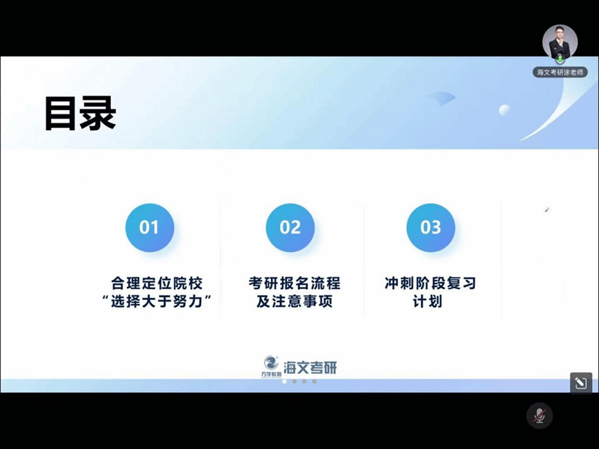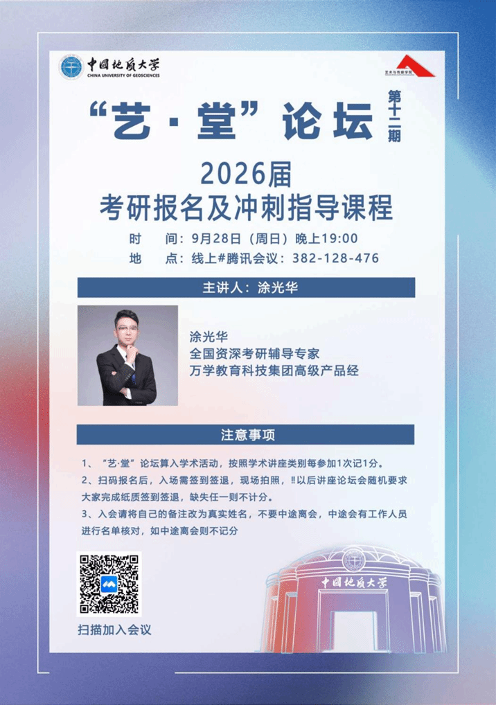 为帮助同学们精准把握最新考情、科学规划复习节奏、破解备考路上的困惑,9月28日晚上19:00,米乐mile官方网站于线上举办了第十二期 “艺・堂” 论坛2026届考研报名及冲刺指导课程。本次分享会邀请了全国资深考研专家、万家教育科技集团高级产品经理涂光华老师担任主讲人,旨在为同学们提供一场内容详实、指导性强的考研全程规划分享。本次活动由兼职辅导员黄灿主持。