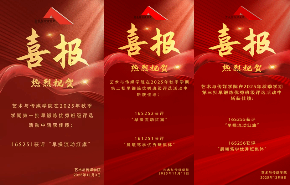 在近期总结评选中,161251班与16S256班凭借出色的出勤率、良好的晨读秩序与饱满的精神面貌,荣获 “晨曦笃学优秀班集体” 荣誉称号。他们的表现充分展现了艺媒学子积极向上的风貌,也为其他班级树立了追赶的标杆。