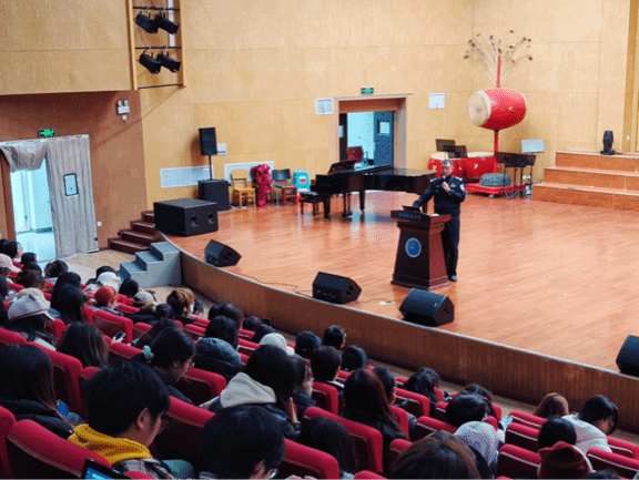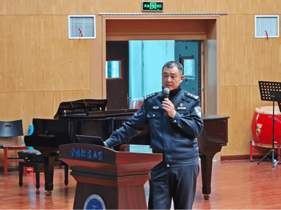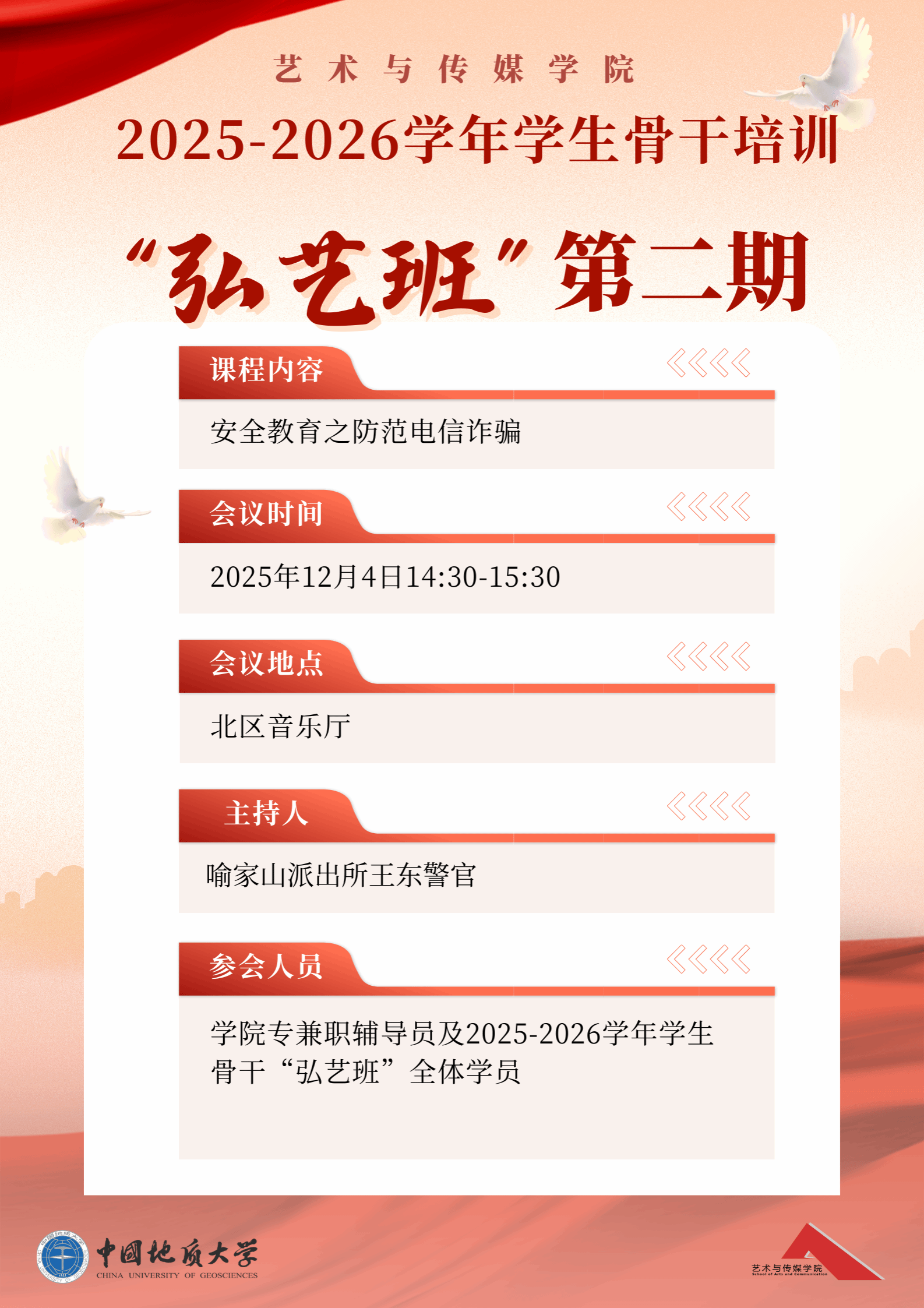 2025年12月4日下午,“弘艺班”学生骨干培训第二期在北区音乐厅举行。本次主题为安全教育之防范电信诈骗,由喻家山派出所王东警官主讲。学工组全体专兼职辅导员,研究生会、学生会、分团委全体学生骨干,以及各班班委,学生宿舍网格化管理员参加本次培训。