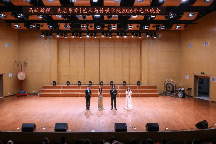 本次元旦晚会由童明辉、蒋昀容、陶雨涵、顾海钧四位同学担任主持人,他们台风亲切、配合默契,串联起一个个精彩瞬间。整场晚会仿佛一幅流动的青春画卷,全方位地展现了艺媒学子多才多艺、朝气蓬勃的精神风貌。