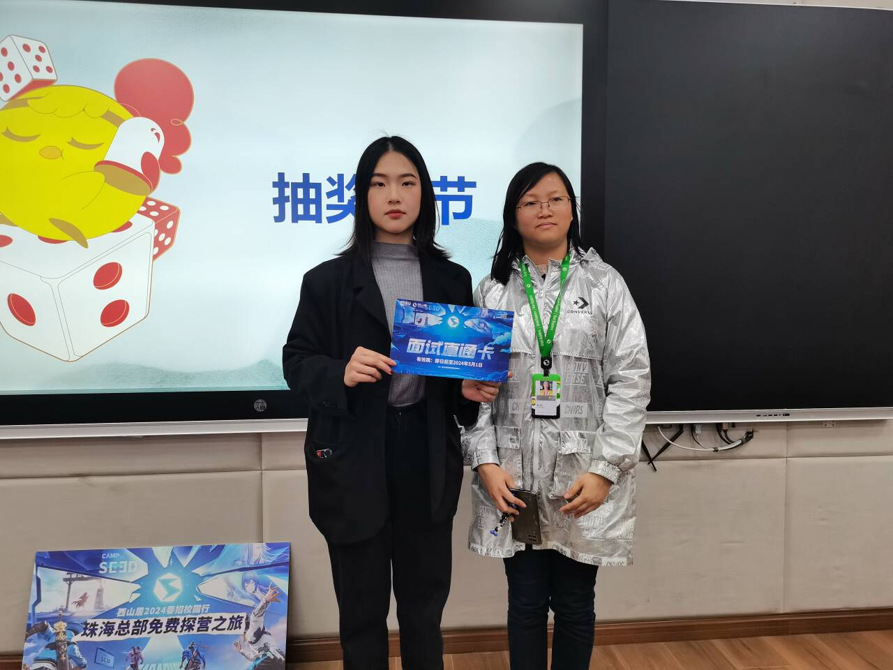 最后,二位主讲人与同学们进行了十分充分的交流与互动,现场进行了抽奖与互动答疑活动,两位同学获得面试直通卡和珠海探营之旅,同时主讲人对同学们提出的问题进行了针对性的解答和建议。