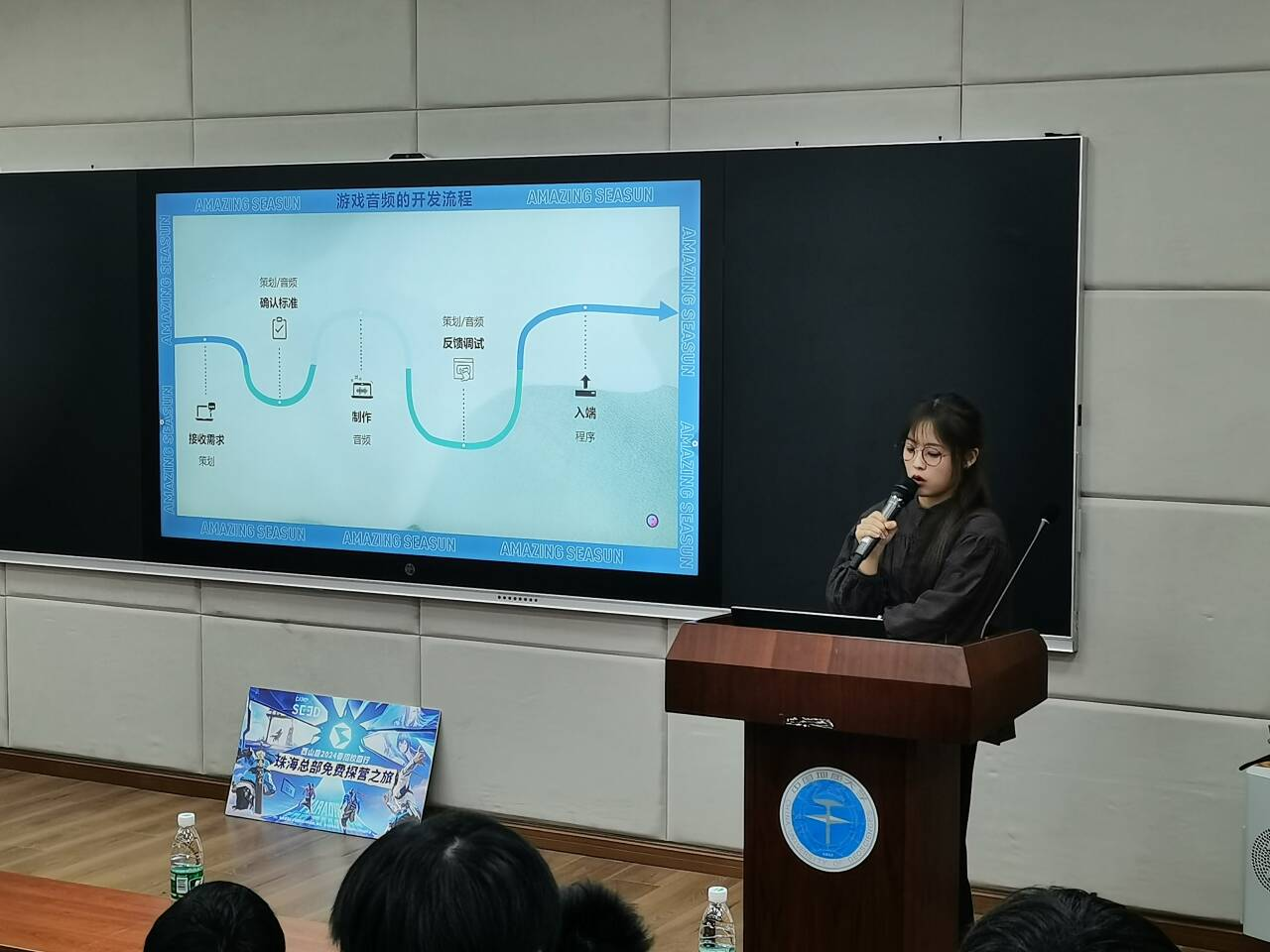 其次,由何文雯为同学们讲解本次招聘会的招聘方向和招聘需求。本次招聘会以音频为专场,主讲人先介绍音频的作用、适用范围,继而介绍音效师的具体工作内容,根据同学们的专长提供多种职业发展方向,例如音频设计师,技术音频,音乐制作人。同时介绍音频训练营,上课内容以及时长,该训练营掌握优秀的制作能力,独立思考能力,沟通能力,受益颇丰。