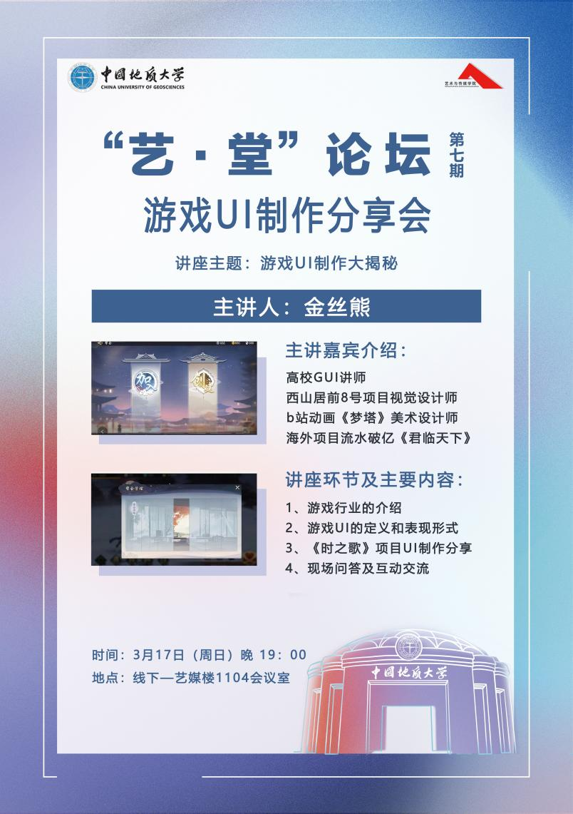 2024年3月17日晚上19:00,“艺·堂”论坛第七期游戏UI制作分享会于米乐mile官方网站1104顺利举行。学院邀请了武汉YOCG艺术的金丝熊老师为同学们进行了有关游戏UI制作的经验分享。本次讲座由兼职辅导员于梦涵主持。