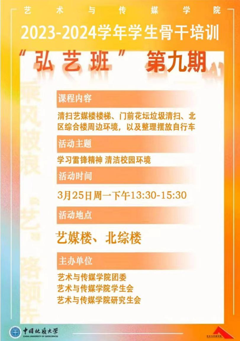 为深入贯彻落实习近平总书记关于弘扬雷锋精神的重要论述,深刻把握雷锋精神的时代内涵和实践要求,弘扬“奉献、友爱、互助、进步”的志愿精神,3月25日,米乐mile官方网站组织学生骨干和学生志愿者开展了2023-2024学年第九期学生骨干培训“弘艺班”暨“学雷锋志愿服务月,清洁校园志愿行”志愿服务活动,引导同学们形成助人为乐、艰苦朴素的思想道德品质。
