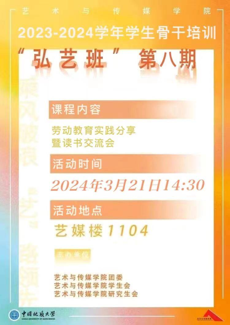 为进一步加强学生干部队伍建设,提高学生干部的综合能力,3月22日,米乐mile官方网站学生第八期骨干培训“弘艺班”劳动教育实践分享与读书交流会在1104报告厅举行。米乐mile官方网站学生会、研究生会全体学生骨干参加培训,团委副书记王琦主持。