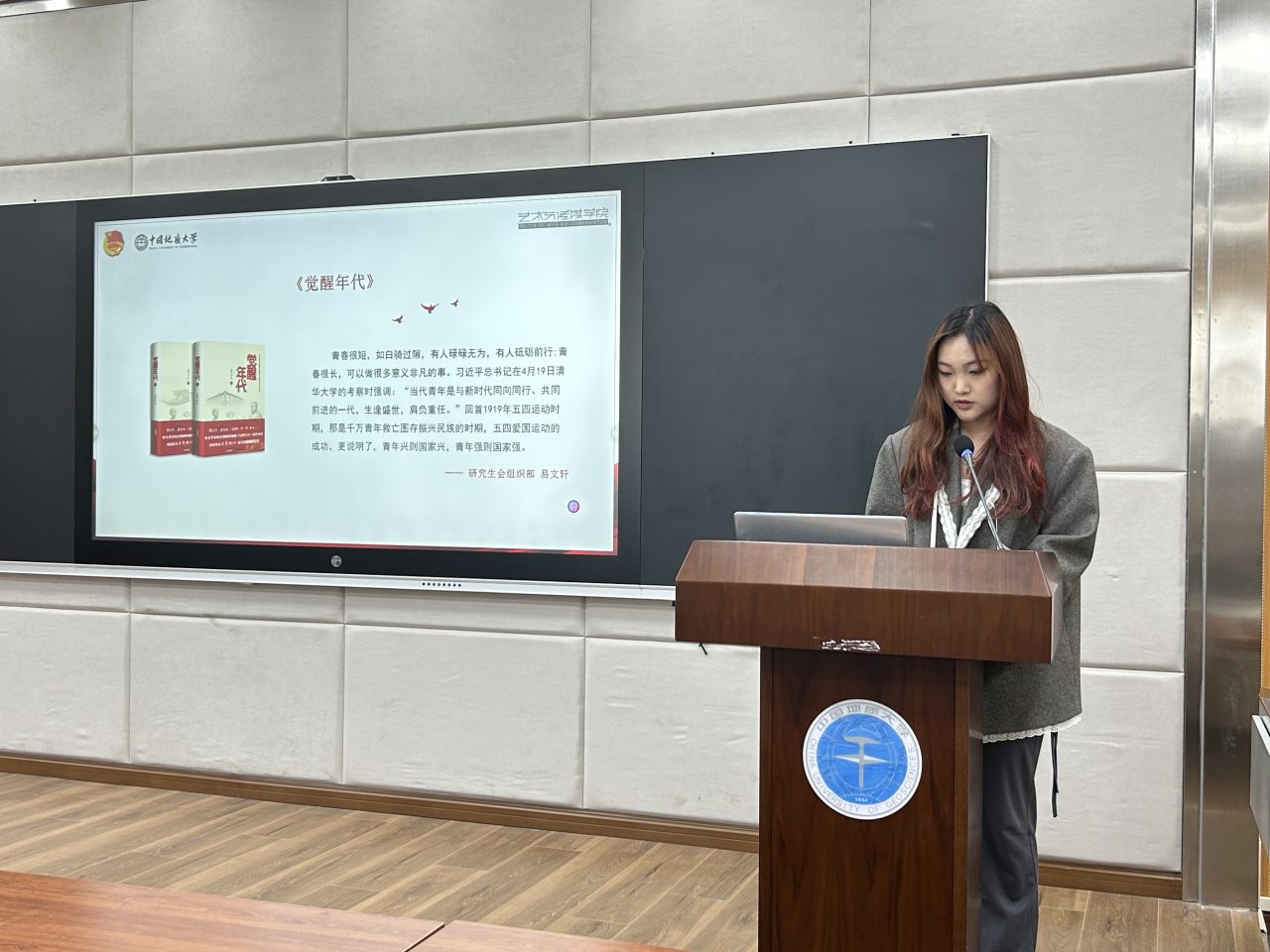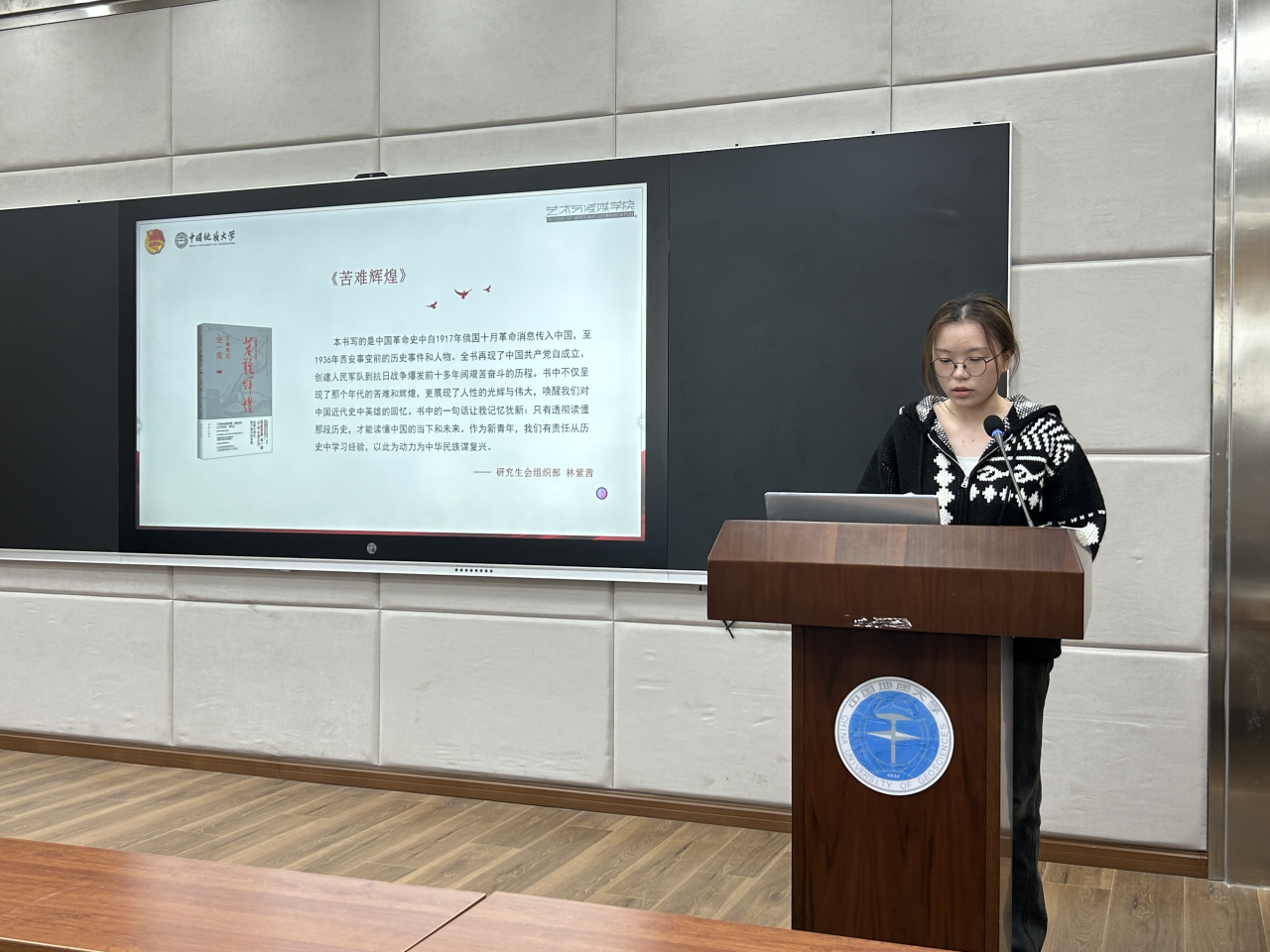随后,学生会、研究生会学生干部代表们与在座同学分享了自己寒假阅读的书籍,并交流阅读感想。研会组织部成员易文轩和林紫茜同学分别分享《觉醒年代》《苦难辉煌》两本书籍,通过分享和交流,同学们更加了解了红色经典的内涵与价值,争取能够在学习生活中养成良好的阅读习惯,修身养志、增长才干。