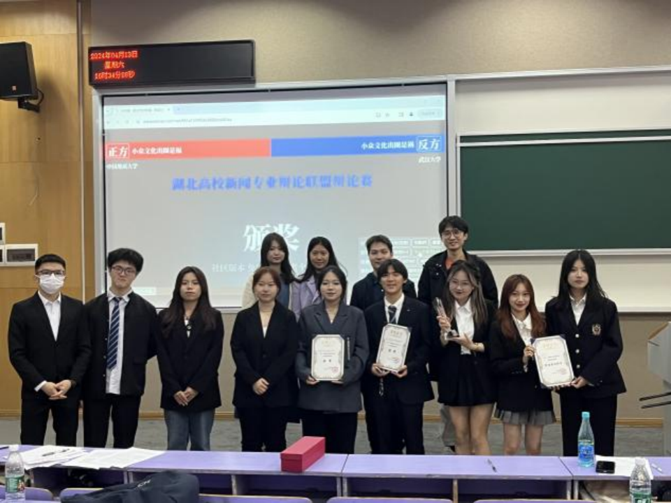 4月13日下午,第十一届湖北高校新闻专业辩论联盟(简称“新辩盟”)辩论赛决赛于我校南望山校区西区教三楼110教室举行。本场比赛,正方米乐mile官方网站米乐mile官方网站辩论队与反方武汉大学新闻与传播学院辩论队就“小众文化出圈是福是祸”这一辩题展开辩论,争夺冠军奖杯。