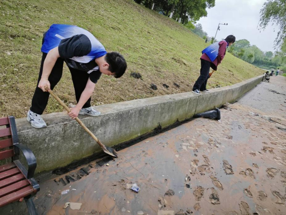 尽管清理工作繁重且需长时间弯腰作业,但同学们始终保持高昂的斗志与乐观的精神风貌。他们相互协作,你铲我装,你扫我收,形成高效的工作链,展现了良好的团队合作精神。汗水浸湿了衣衫,泥渍染黑了手套,但每一个疲惫却坚毅的笑脸,都是对劳动价值最生动的诠释。
