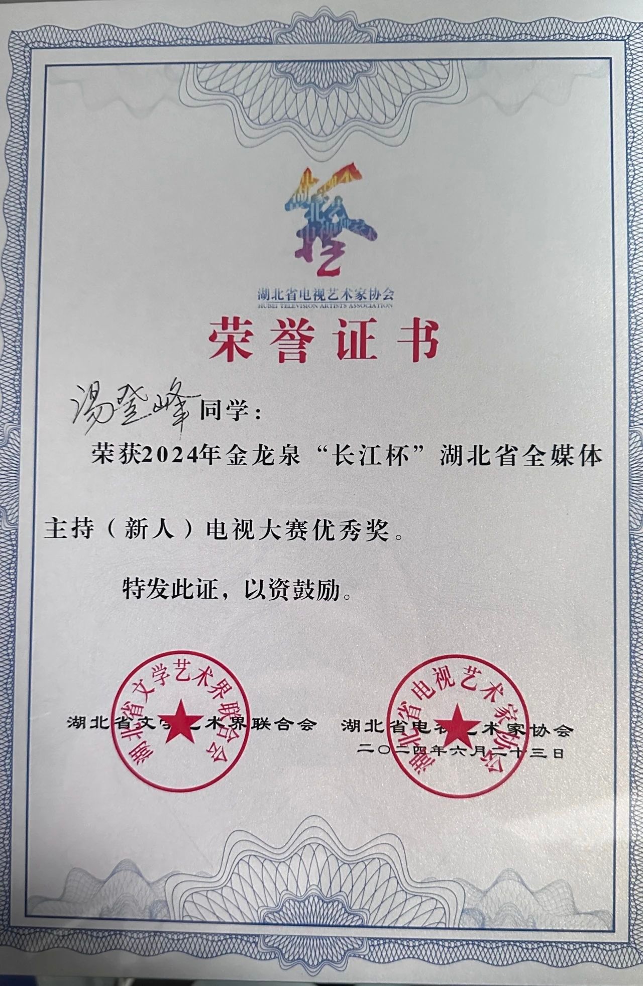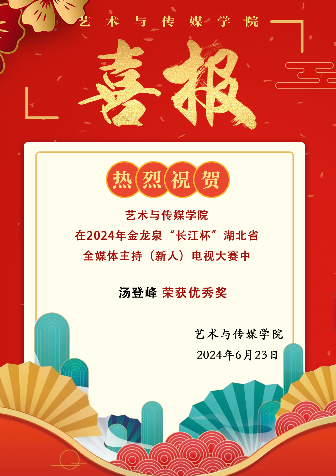 喜报!米乐官网汤登峰同学在2024年金龙泉“长江杯”湖北省全媒体主持(新人)电视大赛中荣获优秀奖!