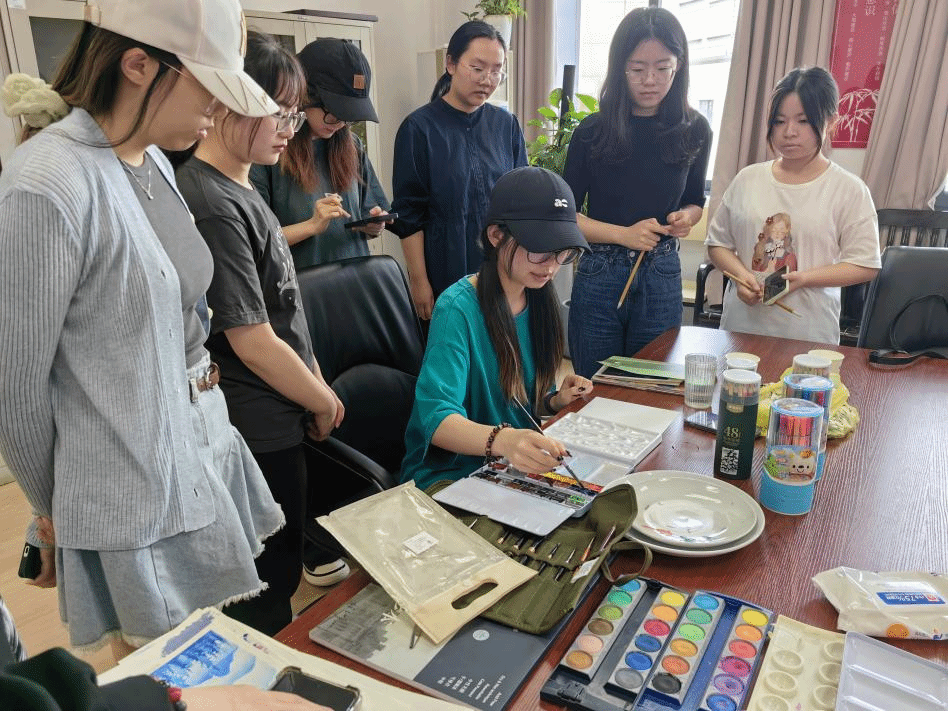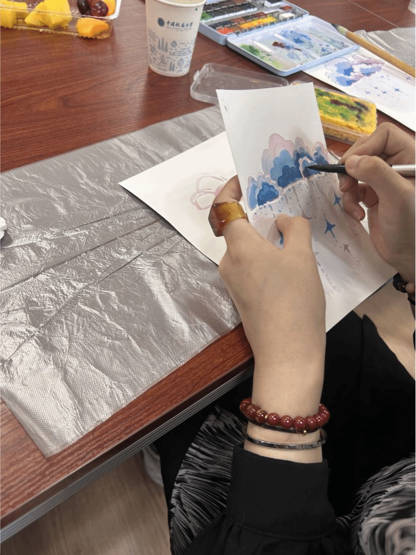 在创作过程中,工作室成员 “艺术疗愈引导者”,穿梭于各小组之间,为大家进行了绘画技巧讲解,包括色彩搭配、晕染方法等。“当水彩在纸上晕开时,感觉心里的烦恼也跟着散开了”,一位参与活动的同学分享道,“平时很少有机会静下心来专注于绘画,这次活动让我重新发现了动手创作的治愈力。”