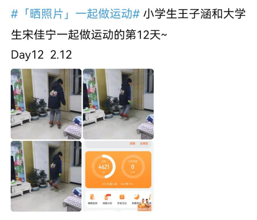 寒假期间,米乐mile官方网站的11名志愿者带领着对接的中小学生一起,通过钉钉、喜马拉雅等网络平台坚持打卡,每天运动不少于30分钟,连续坚持十四天。运动方式多种多样,有跳绳、仰卧起坐、羽毛球等多项运动。们和中小学生不仅在运动中强身健体,获得了成就感,也为建设健康中国贡献力量,同时他们在运动中相互理解,通过合作完成任务,也是对奥林匹克精神的弘扬。