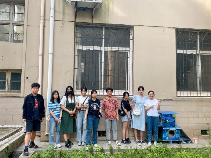 我们给这个猫舍取名为“喵星事务所”,设计理念是我们认为校园里的流浪猫都生活在遥远的喵星球,而我们设计的猫舍是人与猫交流互动的特定场所,猫猫可以在这里沉浸式与人互动,并且享受喵生。我们在猫舍的装饰上选择了梵高的《星月夜》,更加贴合我们的设计理念。