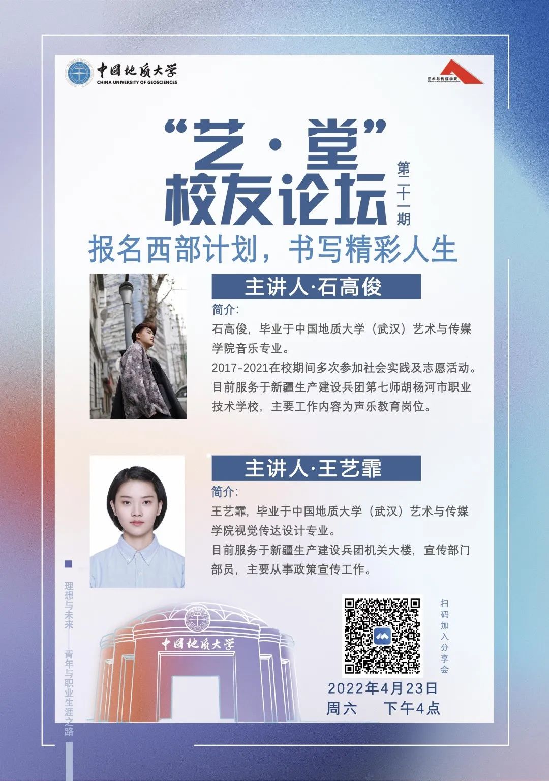4月23日下午4:30,米乐mile官方网站第二十一期“艺·堂”校友论坛“报名西部计划,书写精彩人生”讲座活动顺利进行,由米乐官网音乐专业毕业生石高俊和视觉传达设计专业毕业生王艺霏主讲。