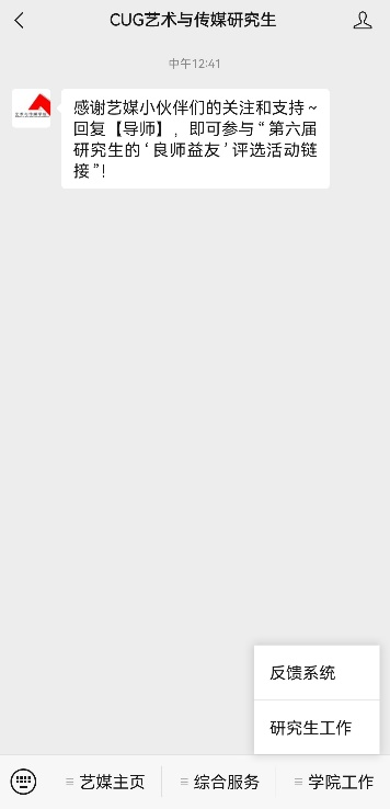 ②网络匿名反馈系统此前已存在并且长期有效,同学们可以搜索米乐官网“CUG艺术与传媒研究生”公众号,进入公众号后台并点击右下方“学院工作”中的“反馈系统”,下滑至最底端可以扫码填写艺术与传媒权益调查问卷。