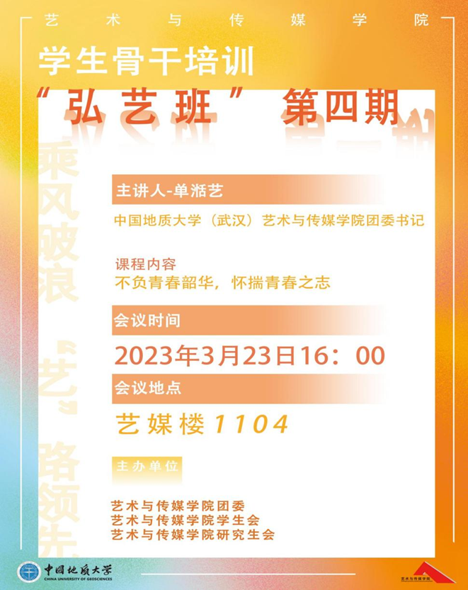 3月23日下午4点,米乐mile官方网站第四期“弘艺班”学生骨干培训在艺媒楼1104报告厅顺利展开,学院学生骨干参加了此次培训。本次课程由米乐mile官方网站团委书记单湉艺老师主讲,主题是《不负青春韶华,怀揣青年之志》。