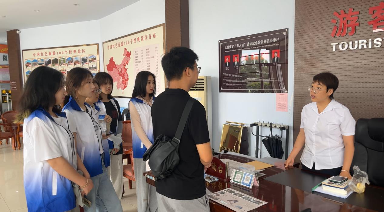 团队在简单了解万人坑的背景历史后,怀着沉重的心情,开启了对大同煤矿万人坑遗址纪念馆的学习调研活动。大同煤矿万人坑遗址纪念馆整体分为“游客服务中心”,“纪念馆”,“万人坑遗址”三个部分。首先我们在游客大厅对负责人进行了采访,负责人向我们大同煤矿万人坑遗址纪念馆的基本情况,并基于纪念馆闭馆装修的特殊情况,负责人还为我们讲解了一些案例,讲述了1937年日军侵占大同期间,日本侵略者“以人换煤”,残酷掠夺煤炭1400余万吨,从山东、江苏、河南、安徽、河北等地抓夫骗人到大同煤矿当劳工。矿工在条件极其恶劣的矿井下,每天服苦役十几个小时,在日本法西斯统治下,导致六万多劳工被折磨而死的惨痛经历。