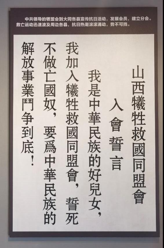“共赴国难”将我们带入抗战时期的艰苦岁月。学生们自发创办抗日自治联合会,各界群众组织大阳丰反帝抗日大同盟(后改为雁北反帝抗日大同盟中心委员会),1936年,在中国共产党的领导下,创办山西牺牲救国同盟会(简称“牺盟会”)。大同人民奋力抵抗着外敌的压迫,无数民众被虐待致死。一群人倒下了,千千万万大同人民又重新站起来,终于,沐浴着无数先烈的鲜血,平型关战役终于迎来了胜利。文物无声,我们仅仅站在这里,却能够听见烈士们用生命谱写的悲壮愤慨的抗战悲歌。在危难时刻,各阶层人民团结一心,众志成城。惨状触碰灵魂,牺牲激发血性,一位位革命烈士舍生忘死,冲锋在前,组织力量与侵略者作斗争。无数有志之士奋起反抗,积极投身抗日战争,“革命到底”。