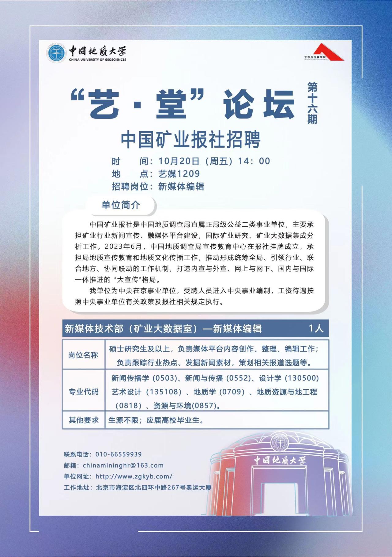 2023年10月20日下午14:00,米乐mile官方网站在会议室1209顺利举办了第十六期“艺·堂”论坛。本次论坛的主要内容是中国矿业报社招聘宣讲会,由辅导员单湉艺主持。
